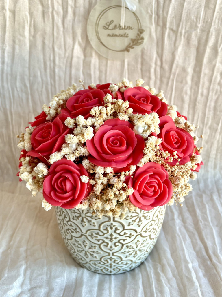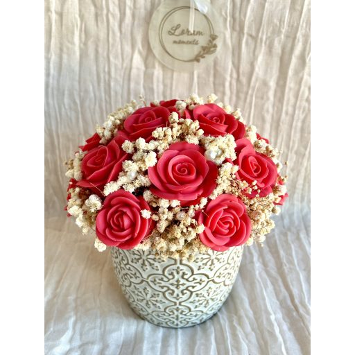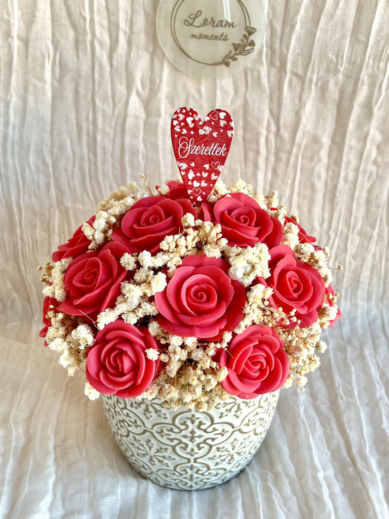 Illatos szójaviaszból formált 17 örök rózsa, természetes szárított rezgőkkel kiegészítve. A gondosan megalkotott kompozíció, gyönyörű és elegáns kerámia kaspóban ölt testet, hogy időtlen eleganciát vigyen bármely térbe. Egy különleges, tartós ajándék, amely hosszú ideig megőrzi szépségét és hangulatát. Tökéletes meglepetés Valentin napra, Születésnapra, Anyák napjára vagy bármilyen alkalomra.